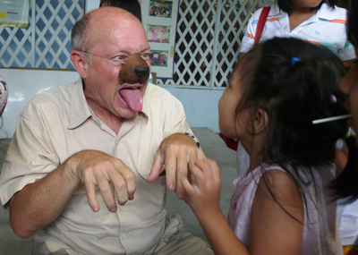 Following the class, Gold bonds with his protégés by donning a rubber dog nose and proceeding to bark, sniff, pant and loll his tongue at them with make-believe canine zeal. The kiddos shriek joyfully and pretend to pat him. “It’s a cheap trick, but it always works,” he explains.